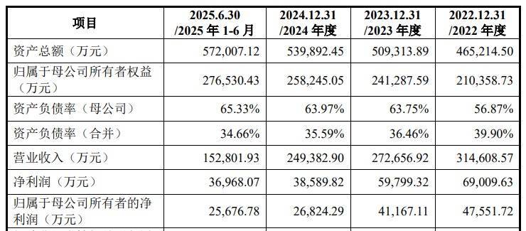 2022年至2024年及2025年上半年,宏明电子实现的营业收入分别为31.46亿元、27.27亿元、24.94亿元和15.28亿元,实现的归母净利润分别为4.76亿元、4.12亿元、2.68亿元和2.57亿元。