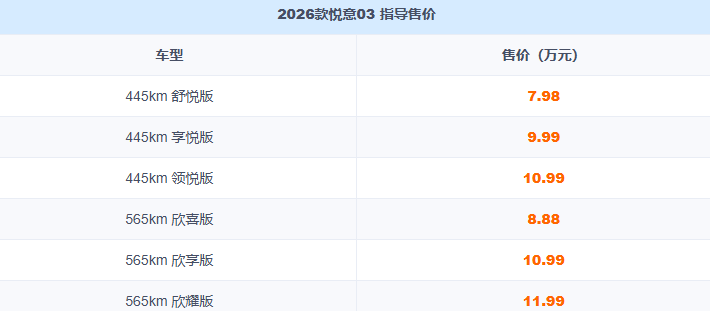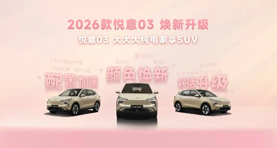 3月8日,一汽奔腾2026款悦意03正式上市,定位“大大大纯电家享SUV”,推出445km、565km两种续航共6款车型,官方指导价7.98-11.99万元,以20余项升级直击年轻家庭与女性用户核心需求。