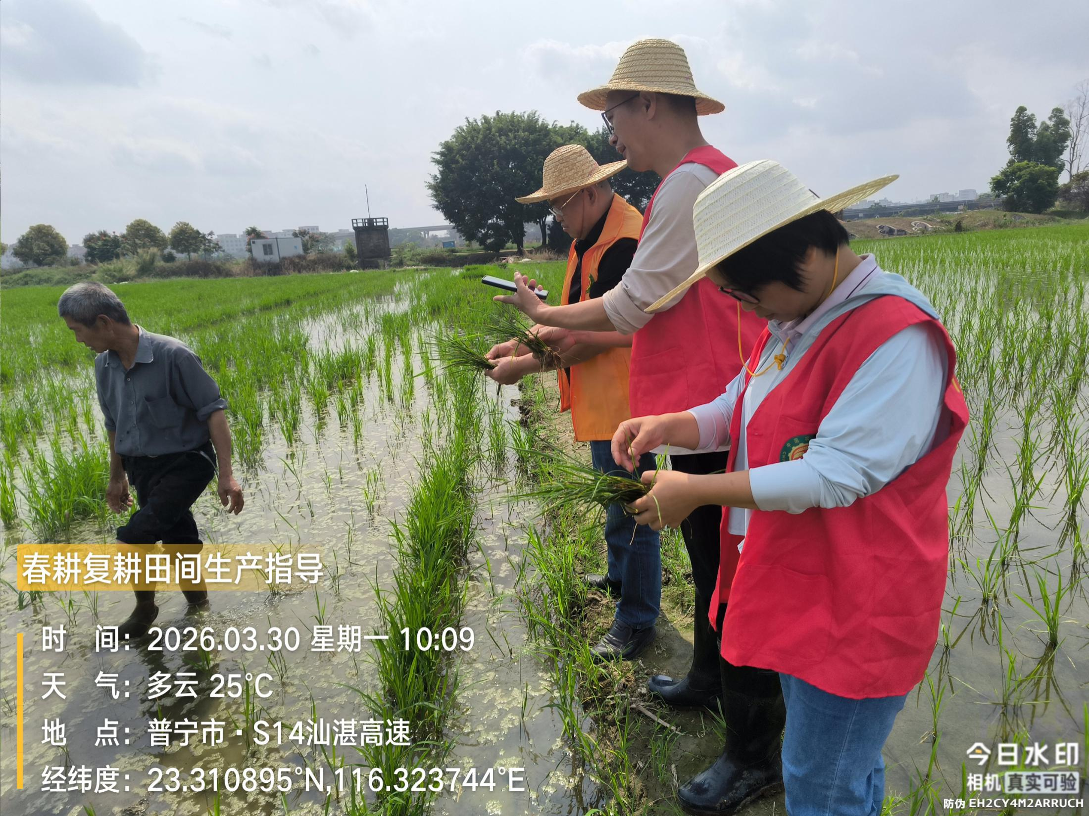 3月29日,普宁市南径镇青洋山村一水稻种植大户紧急求助:其种植的100亩水稻在插秧15天后出现不分蘖、叶片呈葱叶状未张开等问题,前期虽已施药但未见好转。接到求助后,普宁市农业农村局迅速调派技术力量,于3月30日组织技术指导小组赶赴现场实地“把脉问诊”。